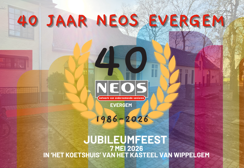 Bij voorkeur inschrijven én betalen via de website of via overschrijving op het rekeningnummer van NEOS EVERGEM - BE41 9730 9127 4610 met vermelding van 'Jubileumfeest'