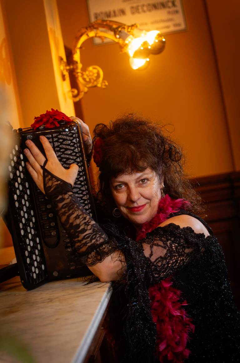 Tine VANDENBUSSCHE, accordeoniste, zangeres, vertelster en cabaretière die ons een namiddag vol verrassingen, absurde kronkels en hartelijke verwondering brengt. Wanneer zij het podium betreedt, weet je dat het publiek op reis gaat—een reis die zich niet laat sturen door platgetreden paden, maar meandert langs de grillige oevers van het bizarre. “Les Histoires Bizarres” is een cabaretvoorstelling, een zinderende collage van verhalen die balanceren op de rand van het absurde en het ontroerende, met een knipoog naar het alledaagse waarvan niemand nog verwachtte dat het zo vreemd kon zijn.