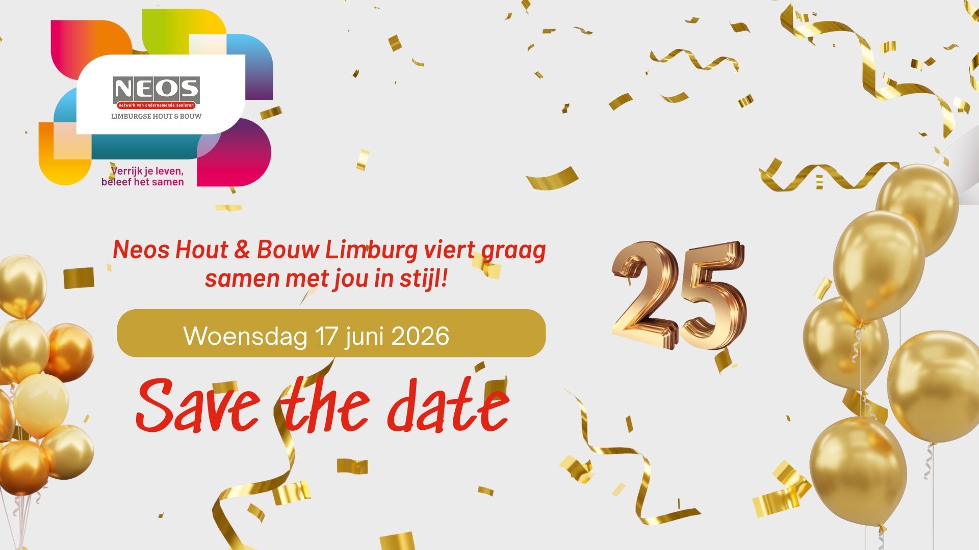 De Limburgse Neos-club Hout & Bouw viert in 2026 een mijlpaal: 25 jaar! Een kwart eeuw vriendschap, activiteiten en herinneringen – dat laten we natuurlijk niet onopgemerkt voorbijgaan. De locatie en details van ons jubileumfeest blijven nog even een verrassing, dus hou deze site goed in de gaten!