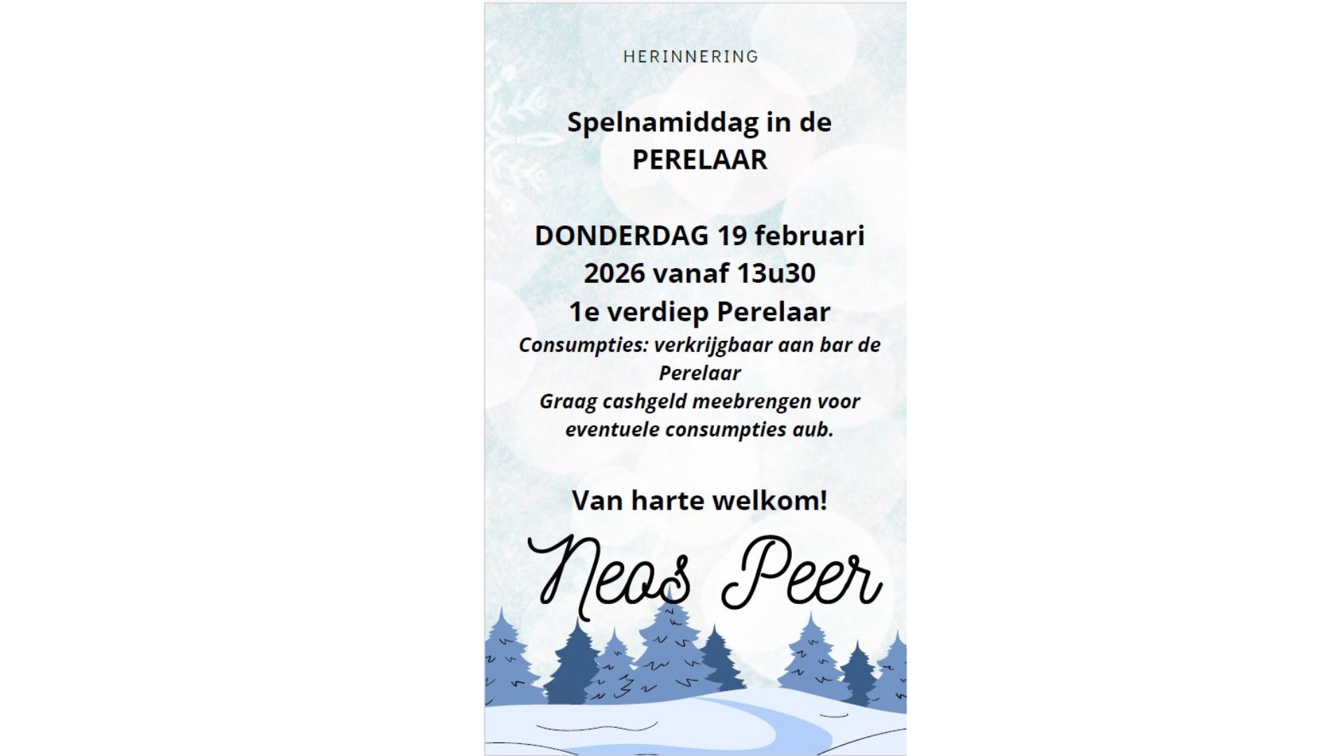 Beste Neos-leden, Op 19 februari 2026 vindt alweer de laatste spelletjesnamiddag van het voorjaar plaats in de Perelaar. We hopen jullie nog één keer talrijk te mogen verwelkomen voor een gezellige namiddag vol ontspanning, plezier en fijne gesprekken. Zoals steeds zorgen we voor een aangename sfeer en de nodige spelmogelijkheden. Groeten het bestuur.