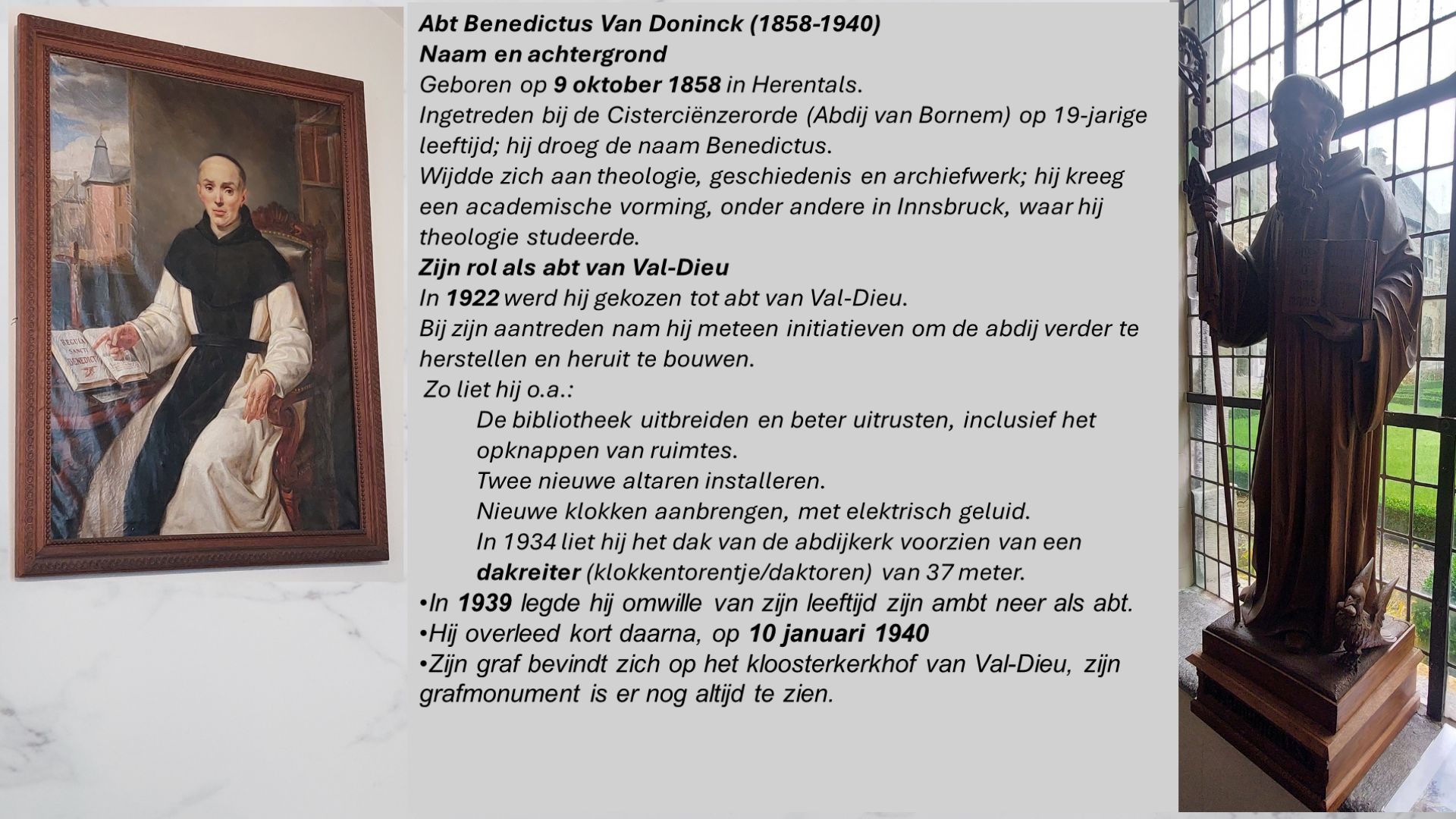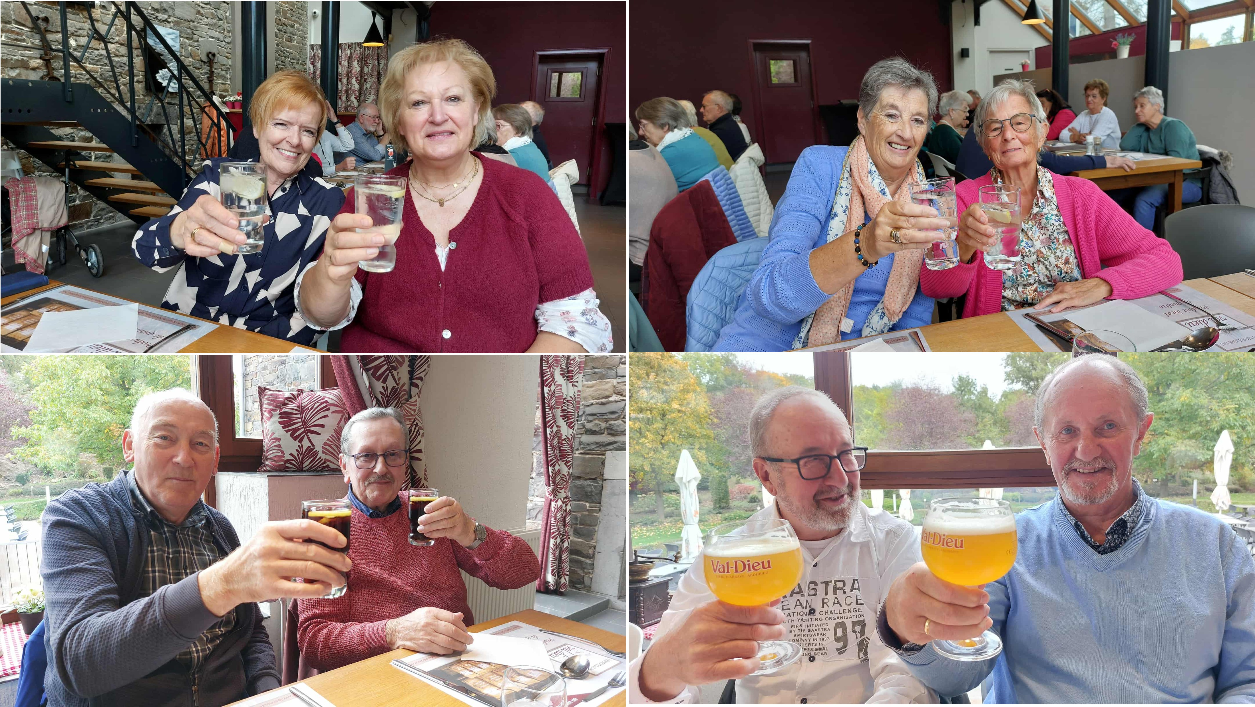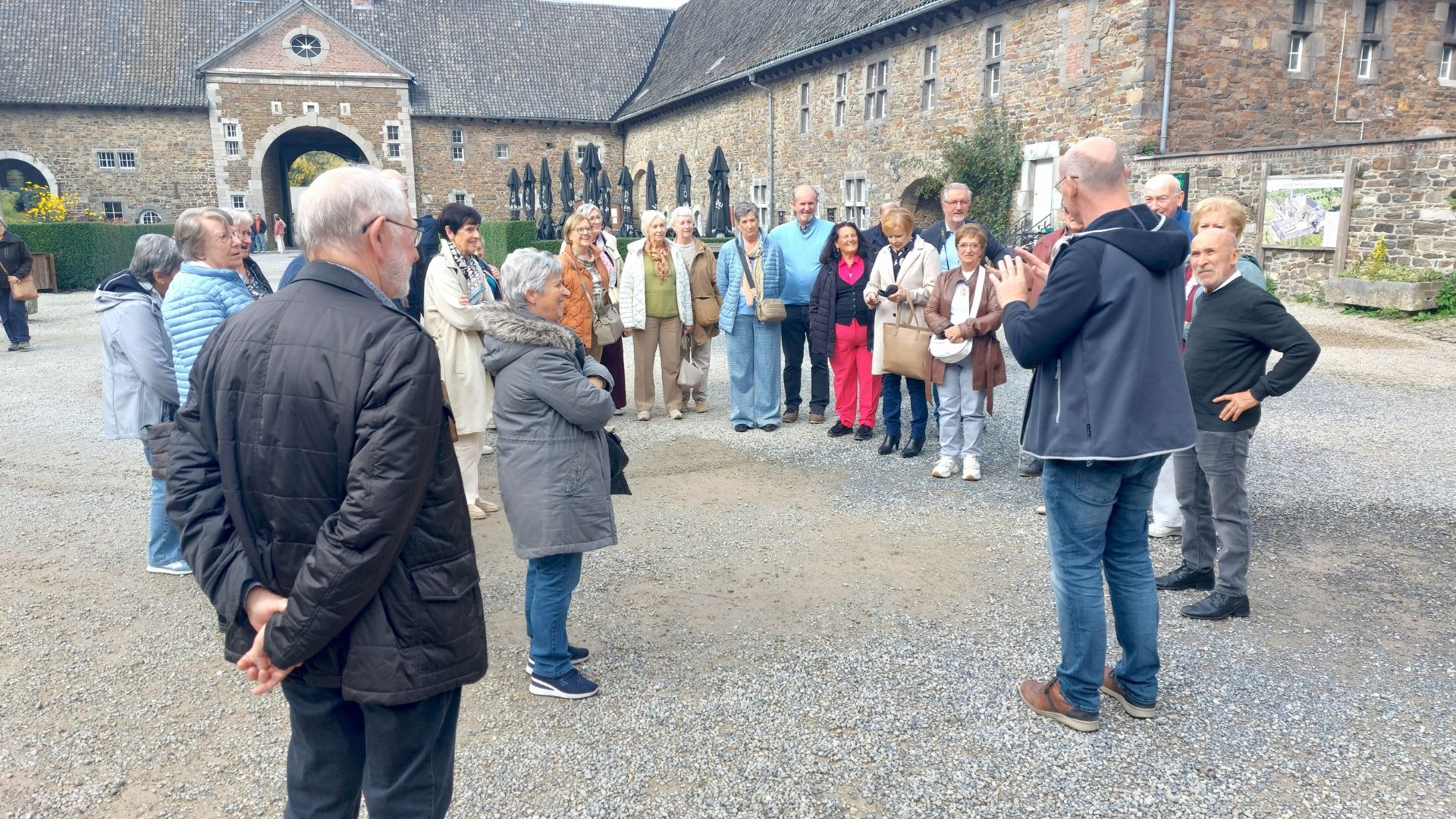 Tijdens het bezoek aan de abdij werden we begeleid door een Nederlandstalige gids die met zichtbaar enthousiasme vertelde over de rijke geschiedenis van Val-Dieu. Zijn uitleg kwam als een echte waterval van woorden — vol weetjes, anekdotes en passie voor het onderwerp. Niemand had tijd om zich te vervelen, want de gids wist elk hoekje van de abdij tot leven te wekken.