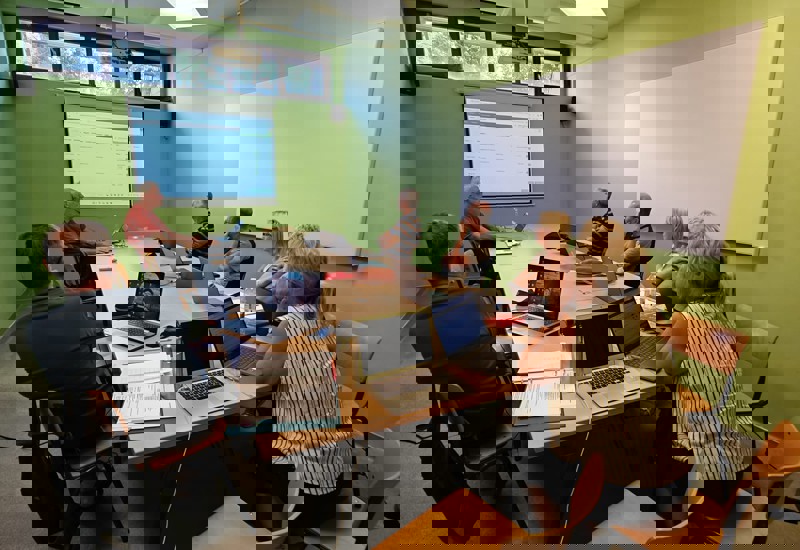 Bezoek aan het distributiecentrum van Colruyt. Logistieke keten en duurzaam ondernemen. Er moeten heel wat trappen gelopen worden tijdens de rondleiding.