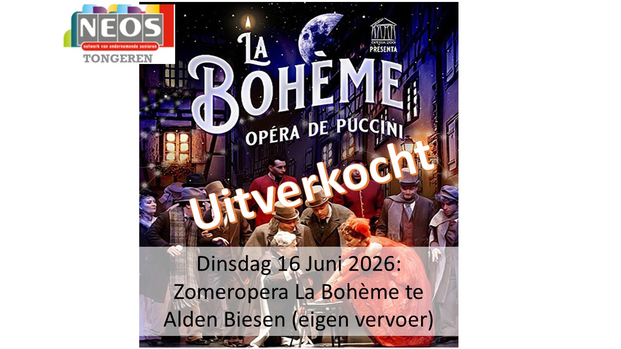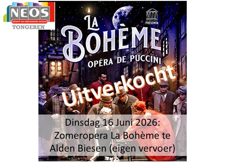 Inschrijven gebeurt via de website www.neosvzw.be/Tongeren of door overschrijving van €44 op onze rekening BE07 4538 1969 6166 met vermelding van “La Bohème” en dit voor 15 april 2026