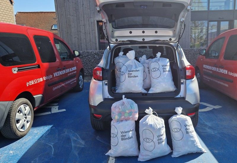 De gespaarde doppen van onze leden brengen we naar het Centrum voor Blindengeleidehonden in Koksijde